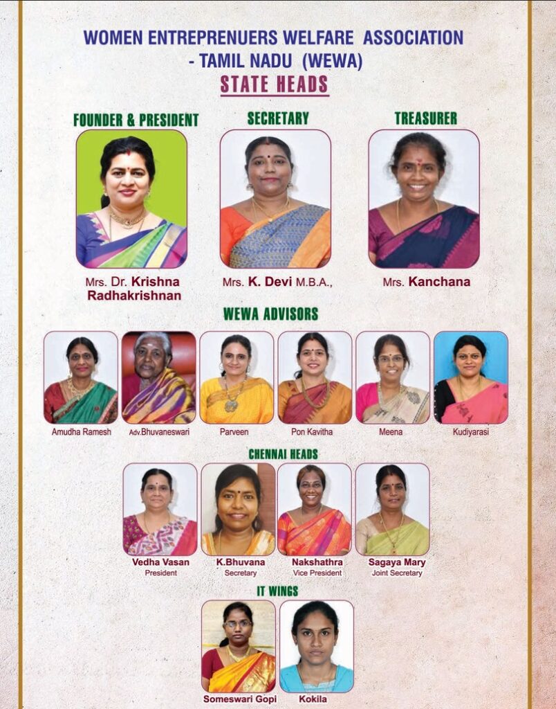 Office Bearers Learn more about Our Association Wewa on Instagram Click here Wewa on Facebook Click here Wewa on Youtube Click here Memebership Form Click here For More Details Please Contact Udhayam Registration Mrs.Kanchana +91 91761 63425 Business Registration Mrs.Someswari +91 80155 42384 Mrs.Parameswari +91 99529 54758 Project Report Preparation Mrs.Sagaya Mary +91 90929 06971 Mrs.Natchathira +91 90031 89063 Loan Assistance Mrs.Vedhavalli +91 96771 87787 Mrs.Buvana +91 96596 71245 Government Subsidy Mrs.Lakshmi +91 73387 88065 Mrs.Meena +91 81248 78192 WEWA is here to help you Grow, Thrive, and Lead because when women empower women, everyone rises.